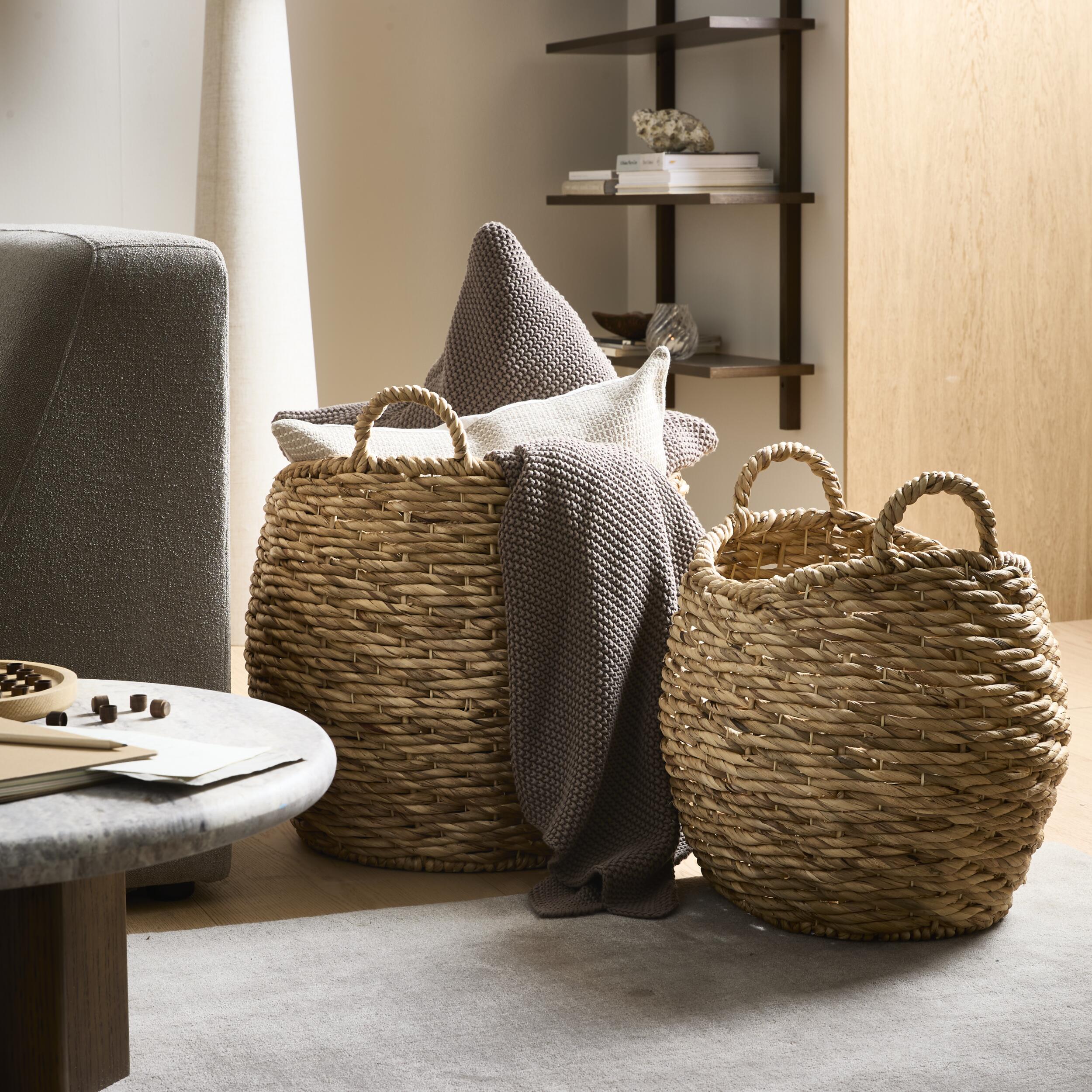 De två korgarna i olika storlekar ger dig flexibiliteten att anpassa dem efter dina behov. De är handgjorda, vilket innebär att varje korg är unik och ger en personlig touch till ditt hem. Med de praktiska handtagen kan du enkelt flytta runt dem där du behöver dem. De blir en integrerad del av rytmen i ditt hem.