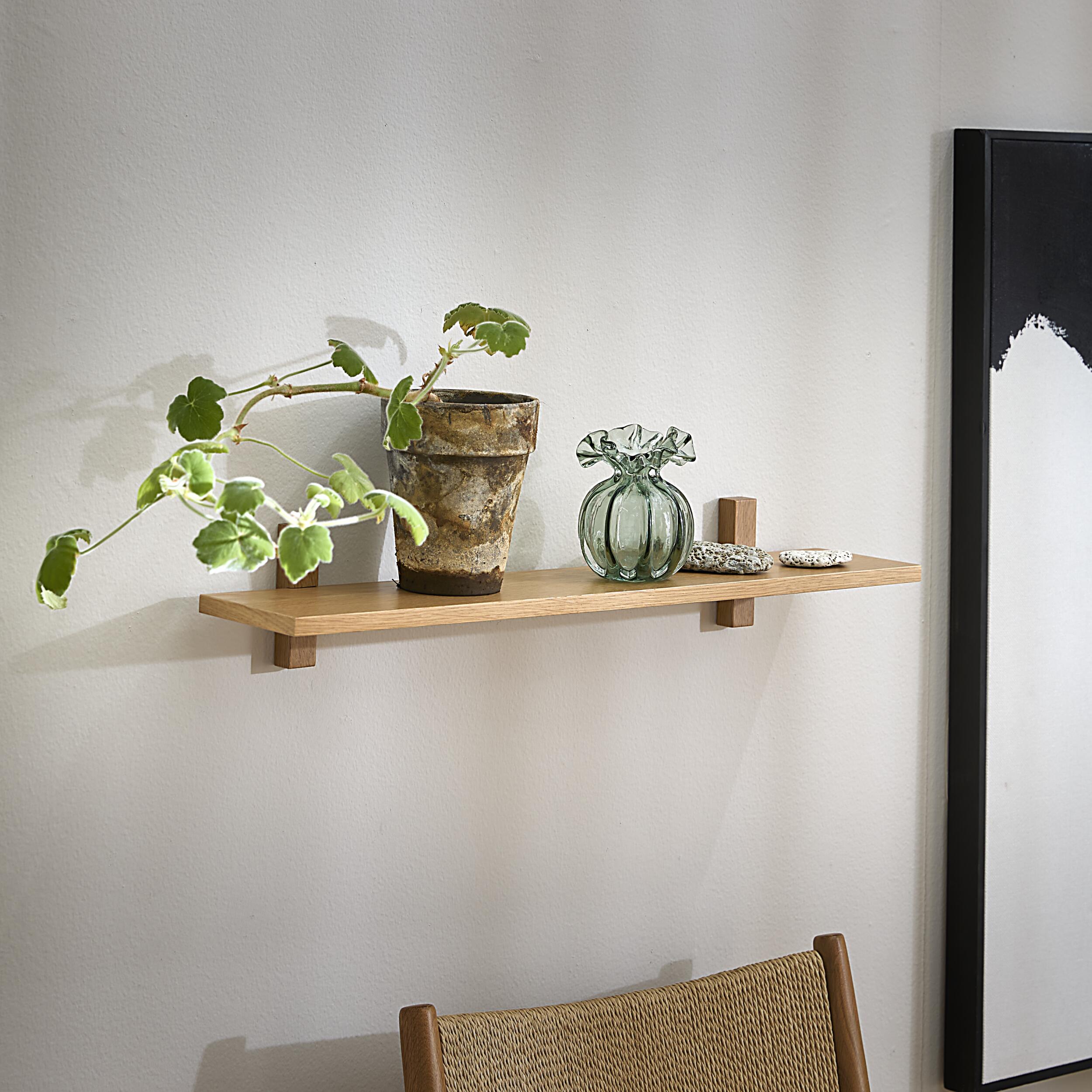 Liten vägghylla med ett enkelt och harmoniskt uttryck där den lätta designen ger plats för både förvaring och dekoration. Hyllplanet är i mattlackad ekfanér och bärs upp av slanka gavlar i mattlackad massiv ek. En funktionell lösning med maxbelastning på 5 kg.