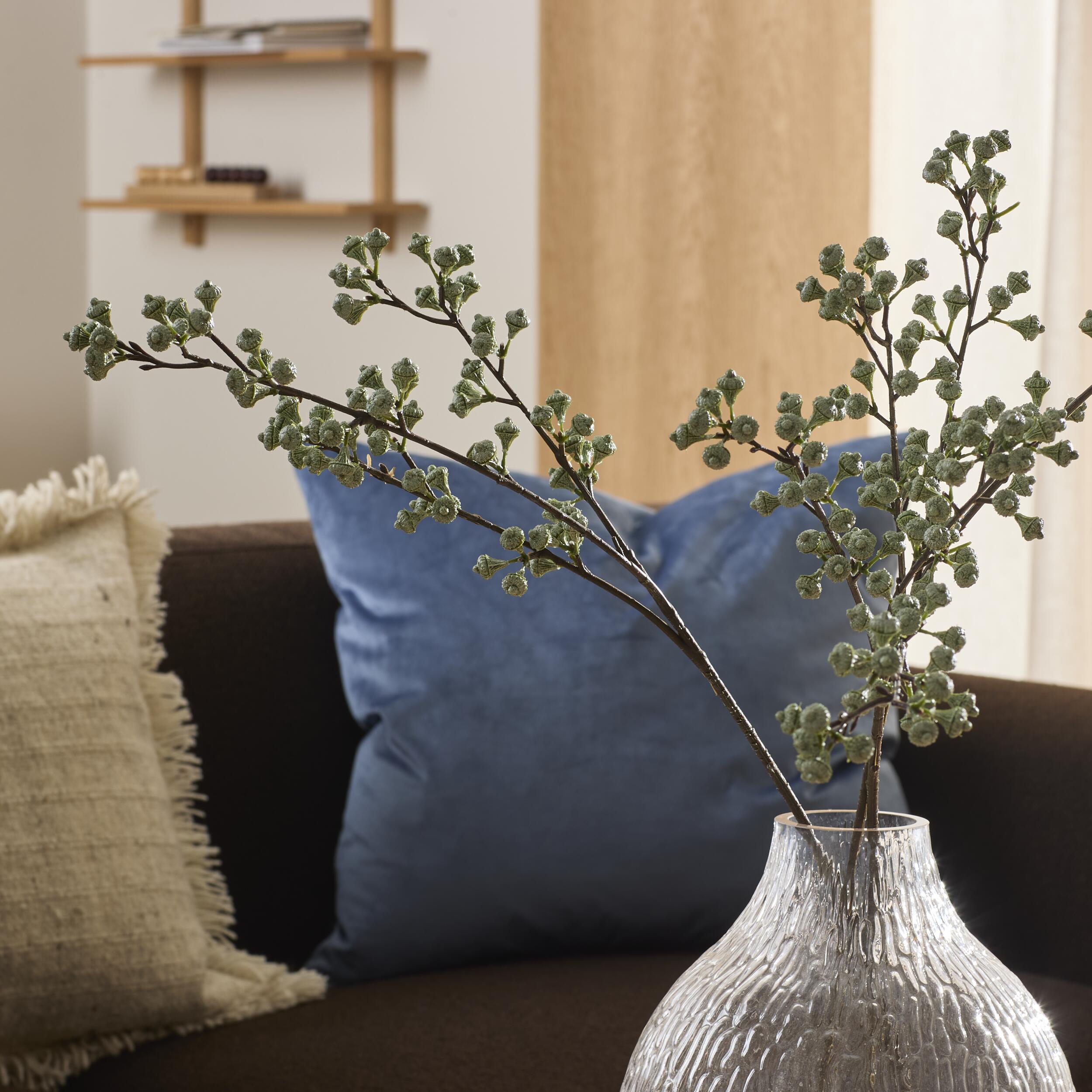 Konstgjord eucalyptus med ljusgröna blad och brun stjälk. Ett klassiskt och stilla inslag i buketter eller som solitär i en smal vas. Ger ett naturligt uttryck utan krav på vatten eller ljus.