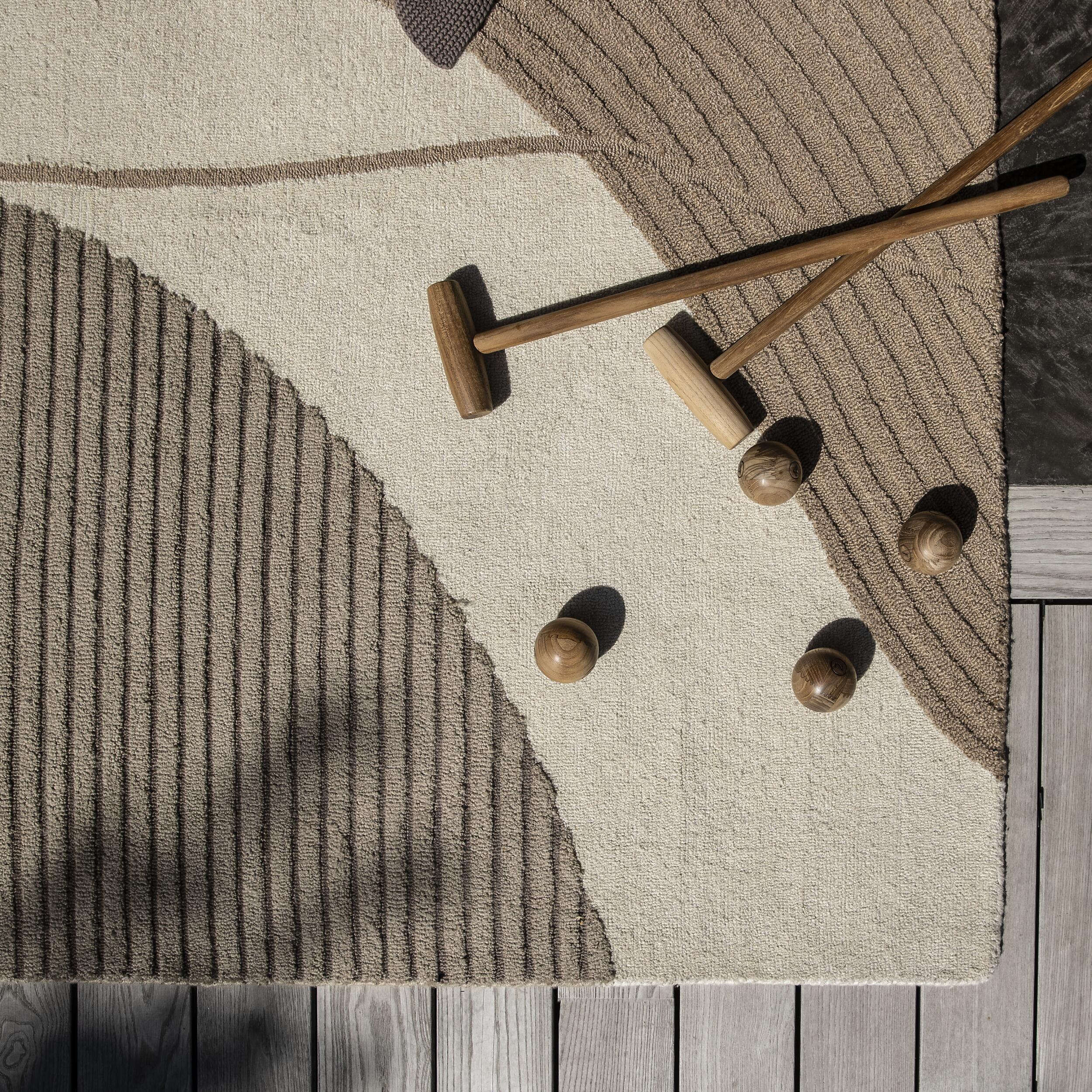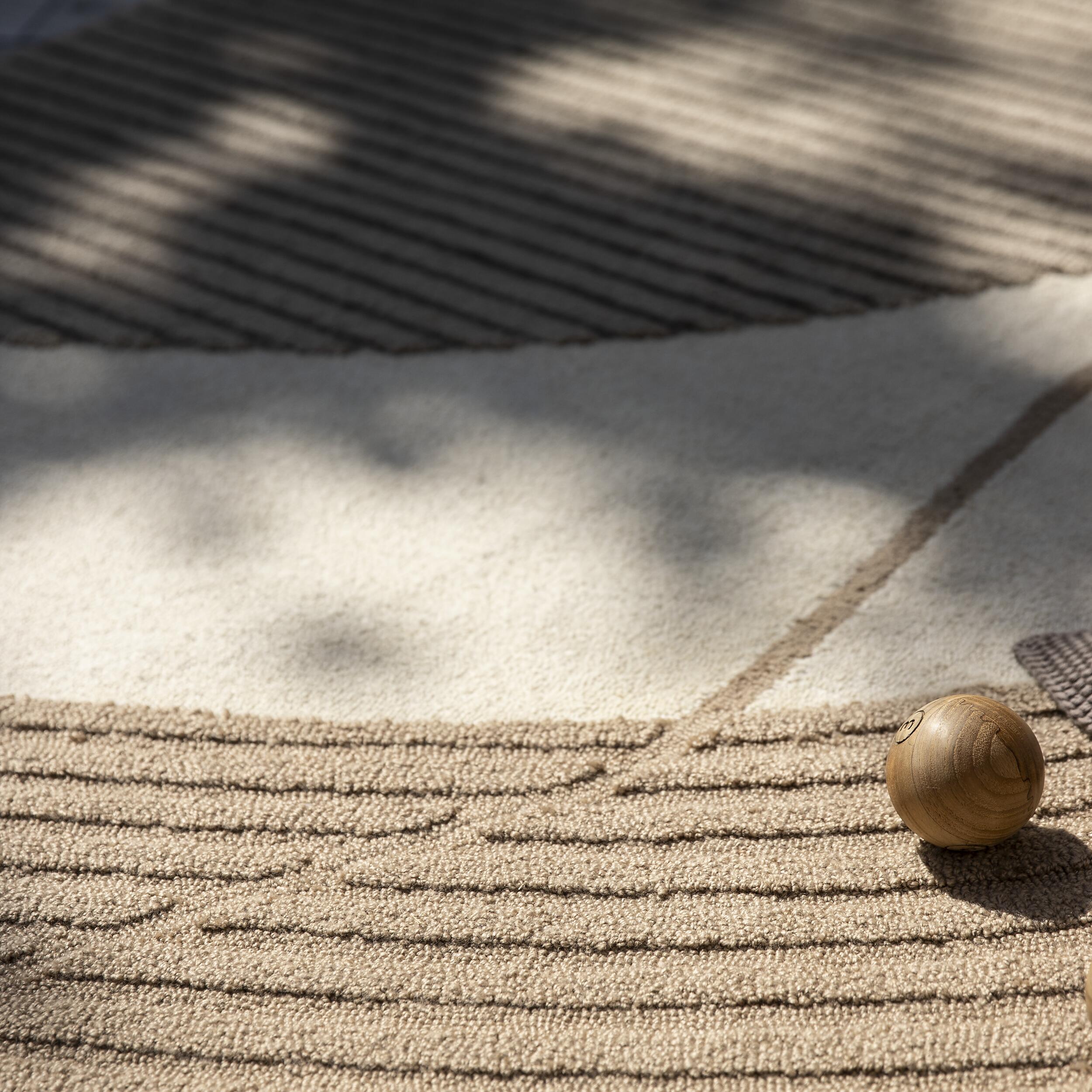 Rilas utomhusmatta är skapad för att binda samman utomhusmiljön. Med sin mjuka yta och naturliga färger tillför den värme och textur till din balkong, terrass eller trädgård. Mattans mönster i beige, vitt och sand skapar ett lugnt uttryck som inbjuder till avkoppling och närvaro utomhus.
