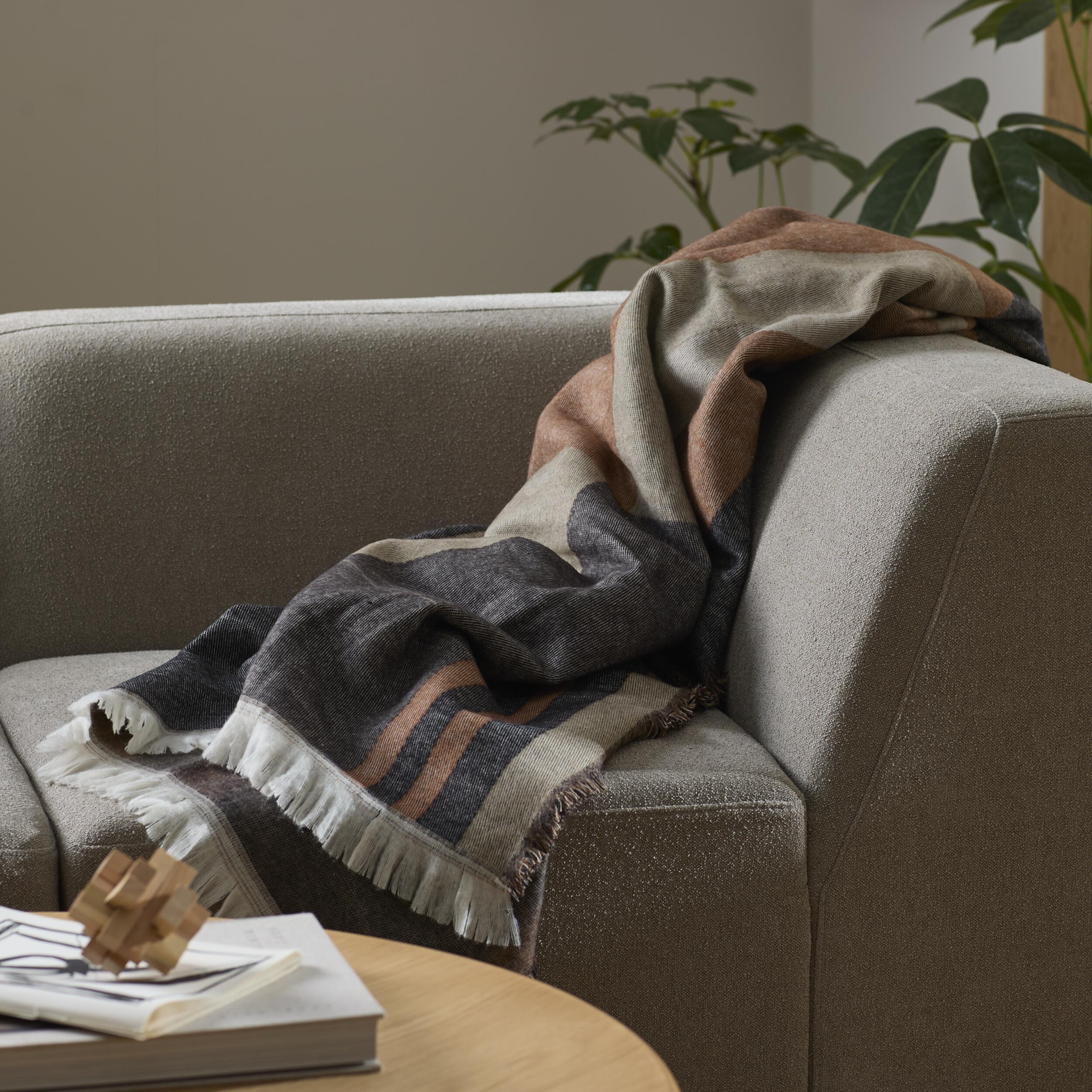• Pläd i choklad, beige, cognac och svart akryl och polyester med fransar. Det grafiska mönstret gör pläden till ett blickfång. Tillför både värme och visuell kant i modern inredning.
