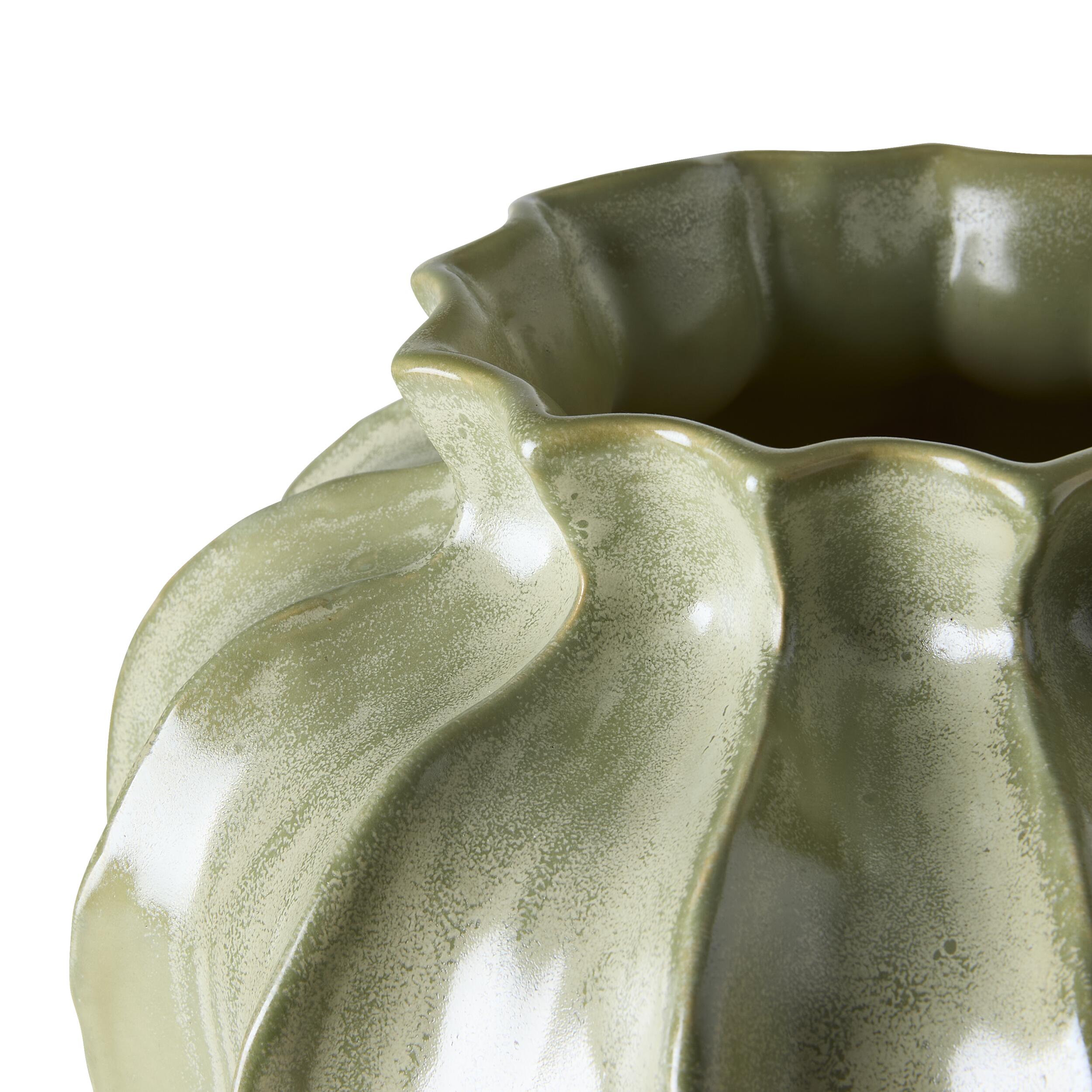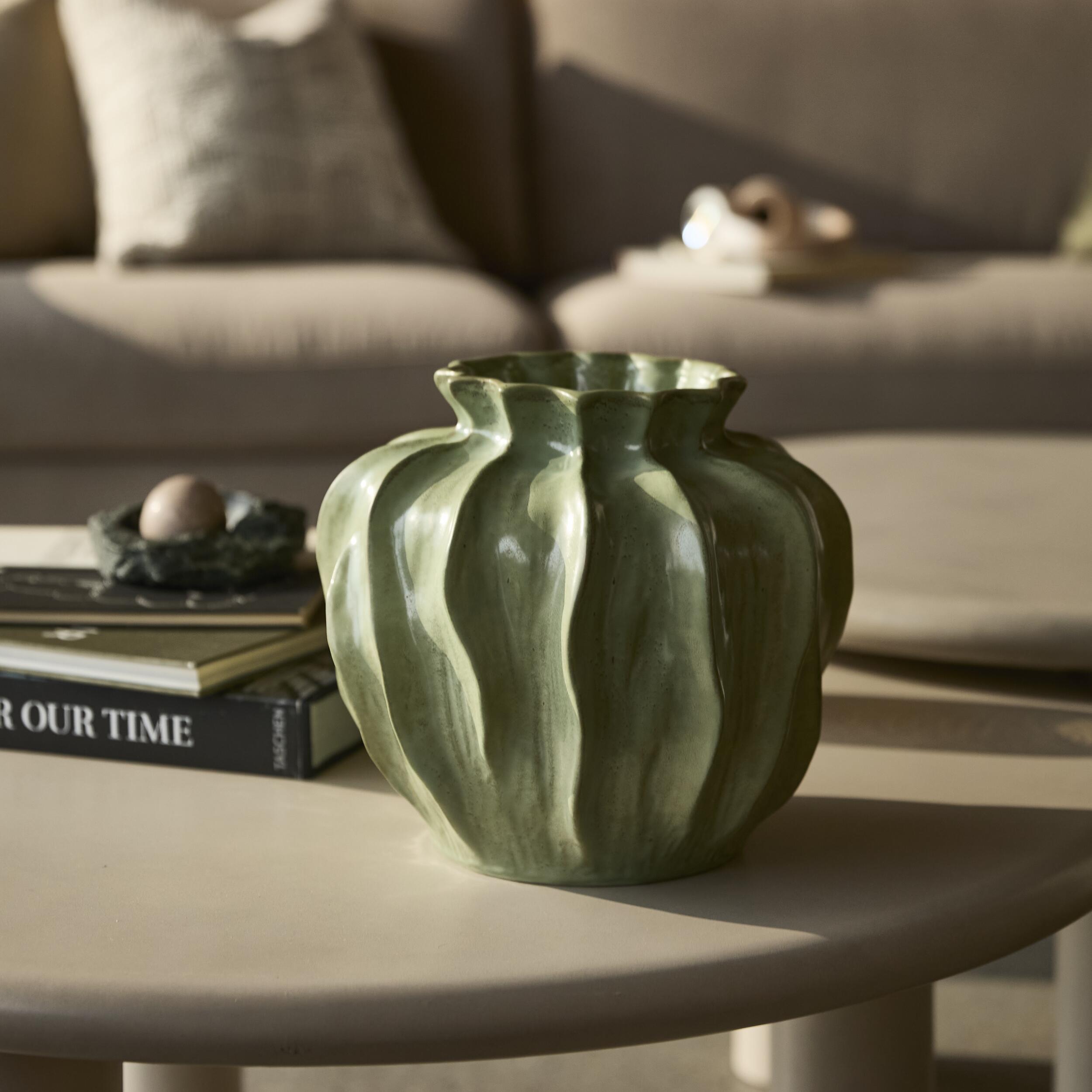 Vasen Frostland är gjord för att föra in naturens lugn i ditt hem. Med sin antikgröna färg ger den en behaglig atmosfär till alla rum. Oavsett om du placerar den på matbordet eller på fönsterbrädan kommer den att smälta in naturligt och skapa en harmonisk atmosfär.
