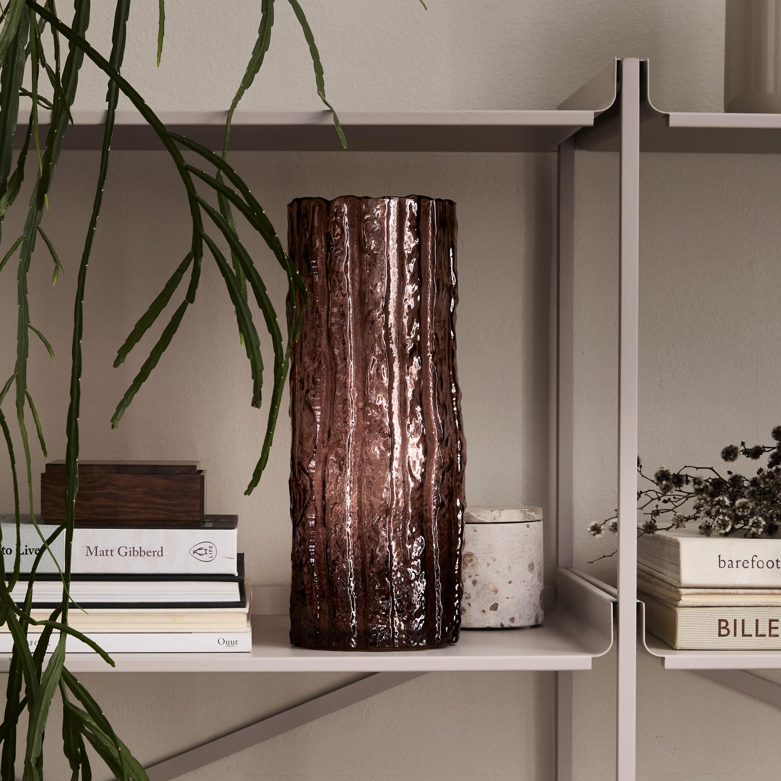 Den rödbruna färgen framhäver vasens mönster och ger en varm och inbjudande ton till din inredning. Glasets textur är både robust och lätt, vilket gör den enkel att placera och kombinera med andra element i ditt hem. Lyvik-vasen är en detalj som både sticker ut och passar in i rytmen i ditt hem.