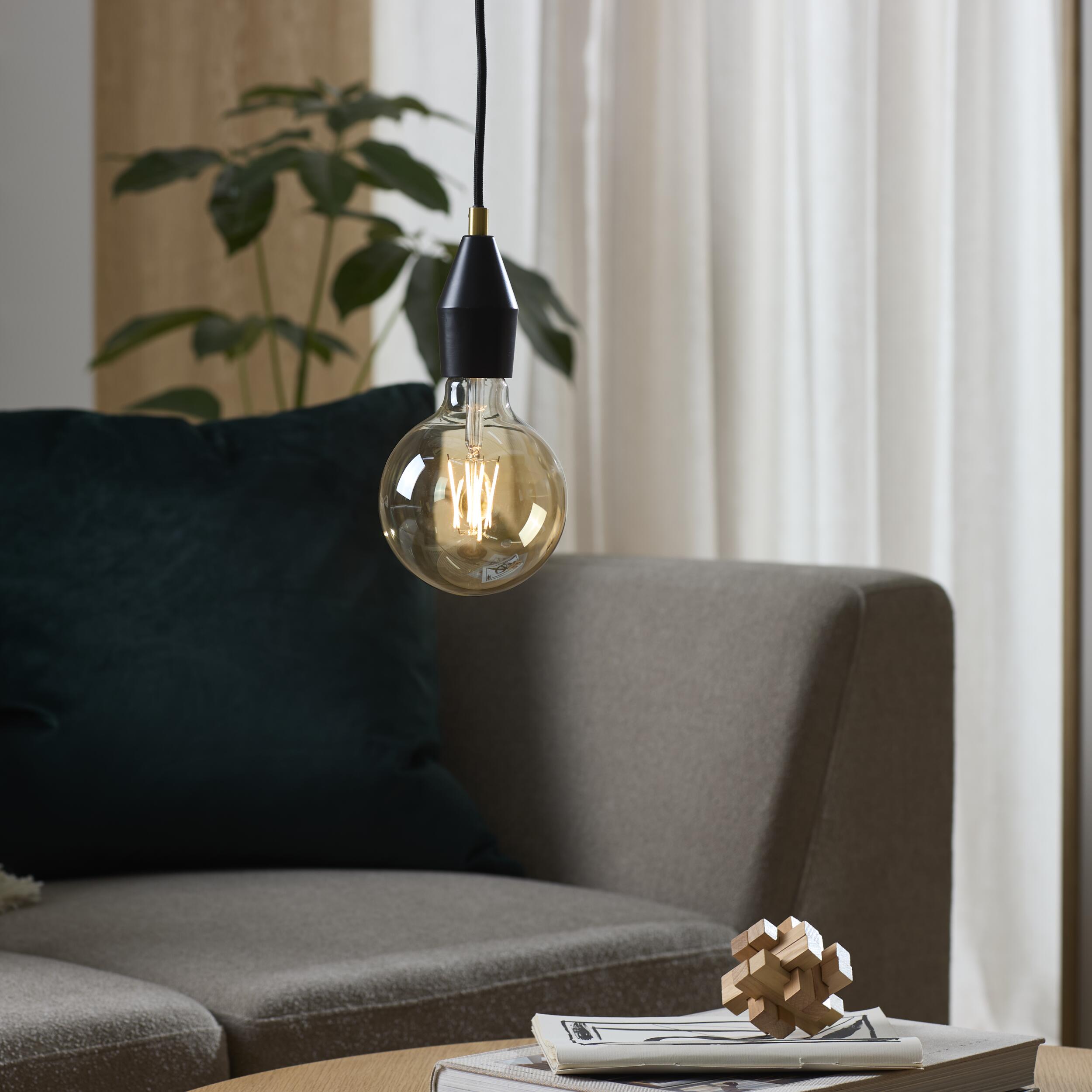 Pendellampa med svart metallfattning, mässingstopp och svart textilsladd. Exkl. glödlampa. E27-fattning och max. 60W.