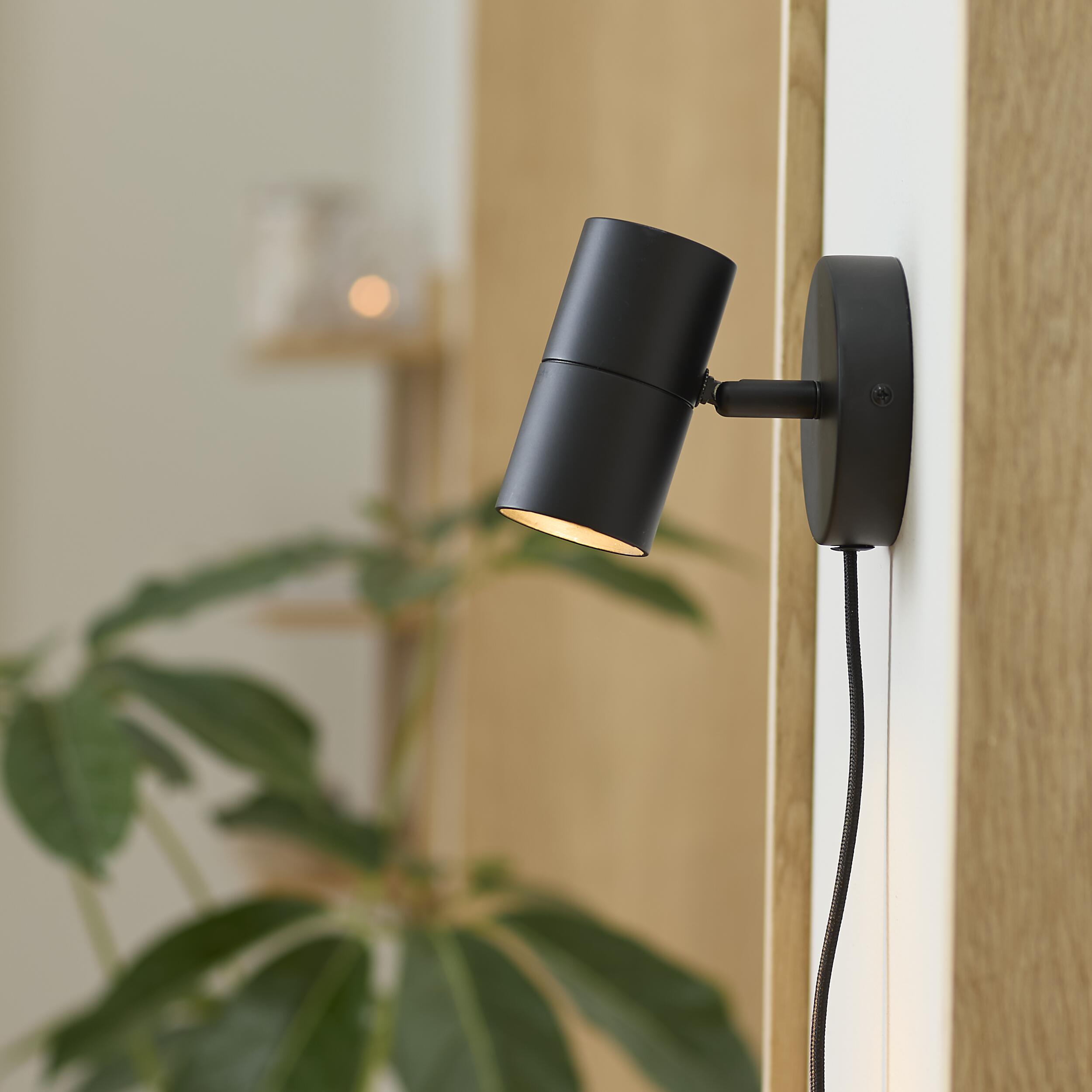 Vägglampa med matt svart lampskärm och bas i metall samt svart textilkabel. Ett kompakt och funktionellt formspråk som passar vid sängen, i hallen eller vid spegeln. Skapar riktat ljus och fungerar som diskret väggdetalj.