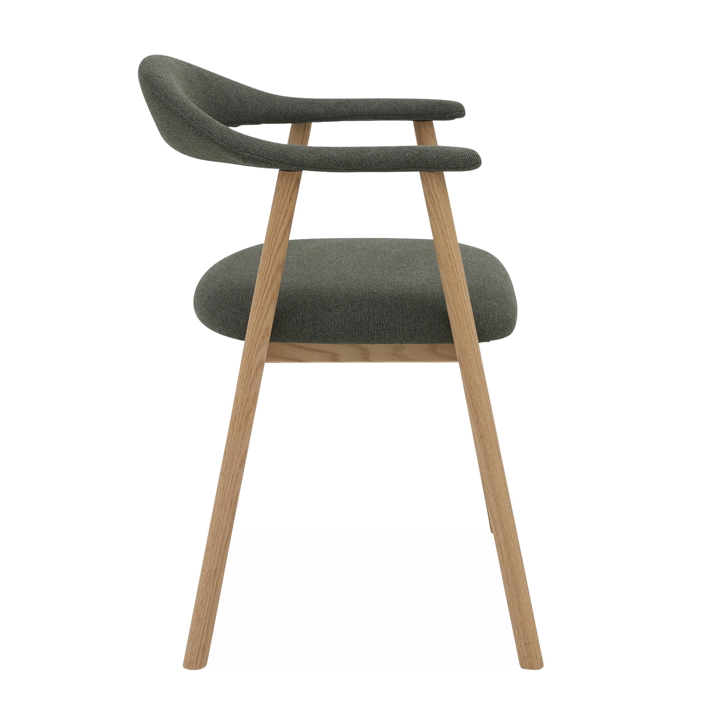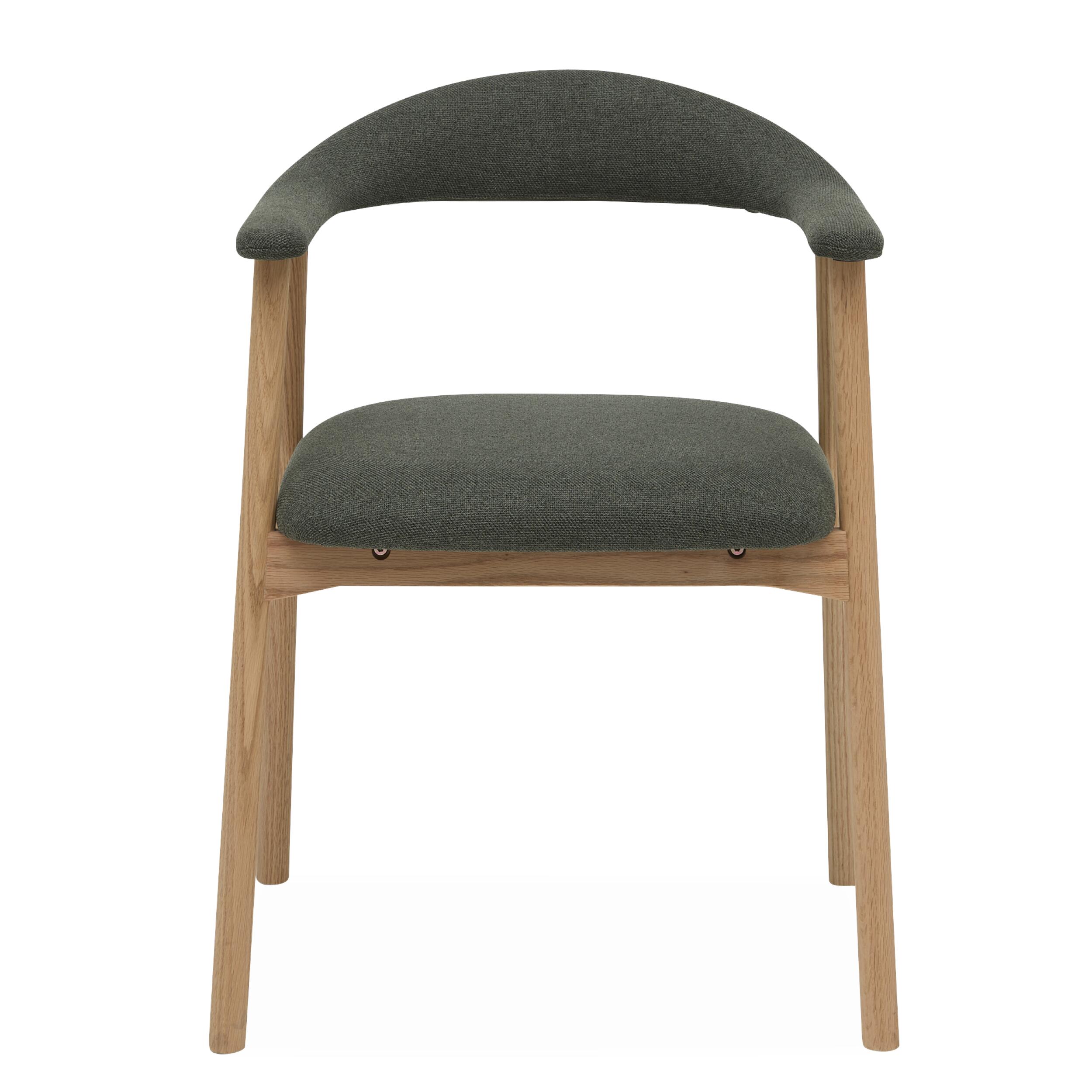Sitsen i grågrönt tyg ger en behaglig komfort som gör det till ett nöje att sitta länge vid bordet. De oljade ekbenen ger en naturlig och tidlös look som smälter vackert in i alla inredningar. Kombinationen av material gör Adler både lätt att flytta runt och stabil när man sitter.