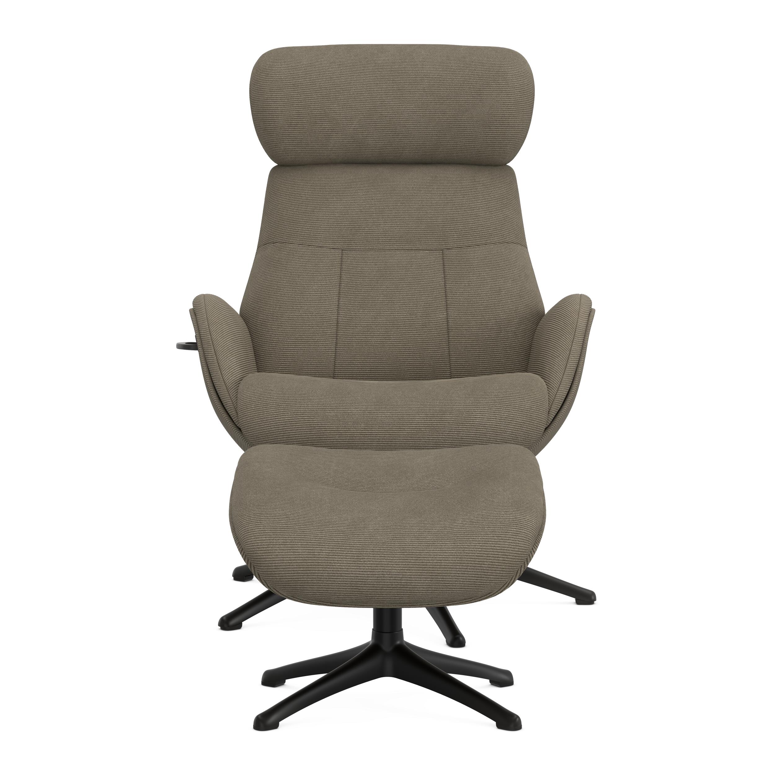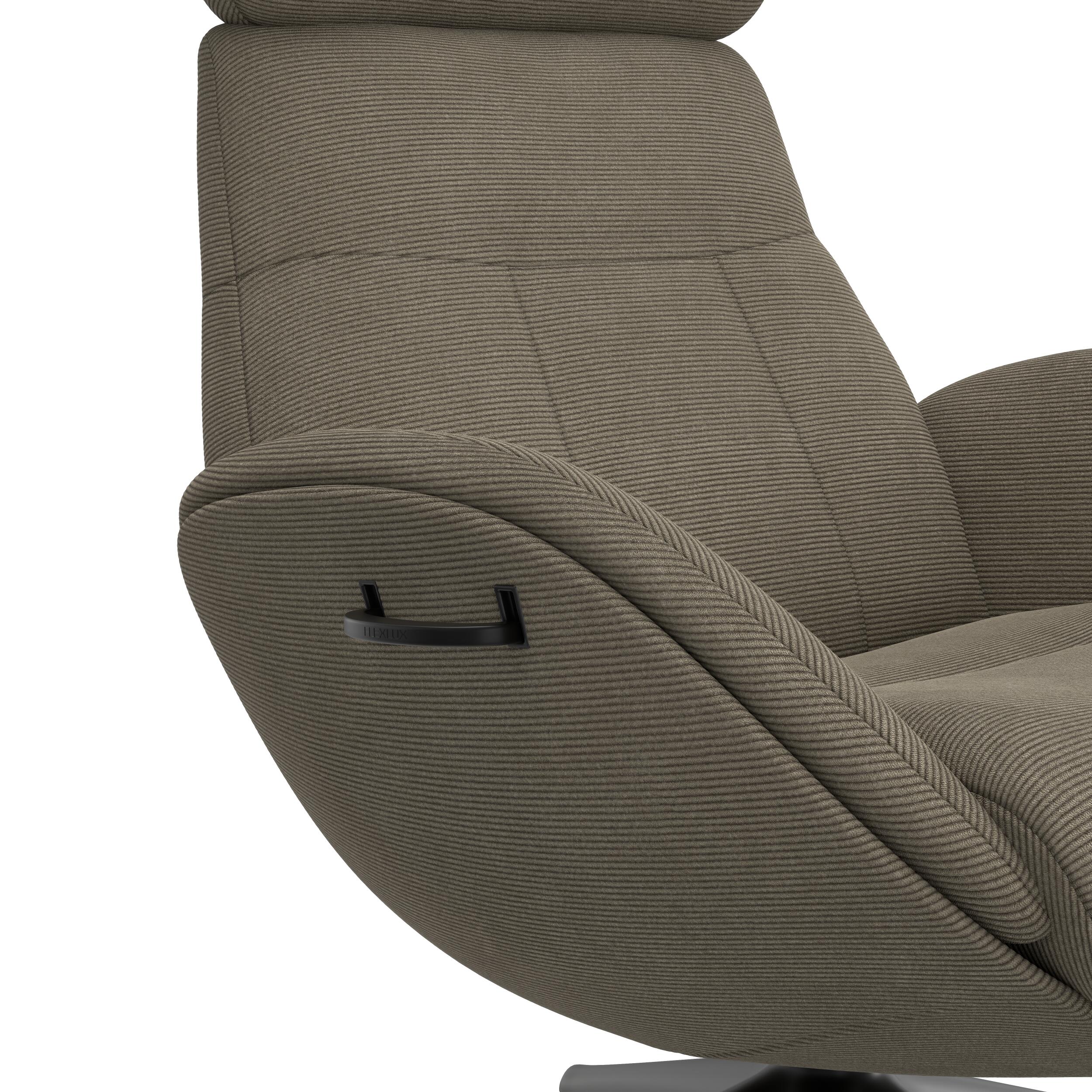 FlexLux Elegant är en stilfull fåtölj designad för avkoppling och lyx. Den höga ryggen och de mjukt rundade armstöden ger optimalt stöd, medan fotpallen säkerställer en bekväm sittupplevelse. Klädd i Wave-tyg i en elegant gråbrun nyans ger fåtöljen en tidlös och modern look. Den svartlackerade aluminiumfoten fulländar den exklusiva designen.