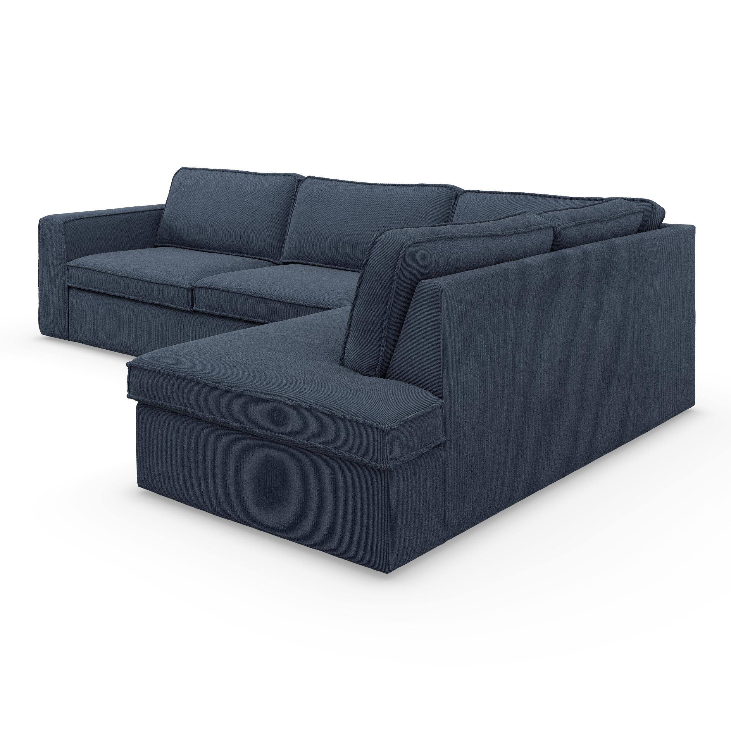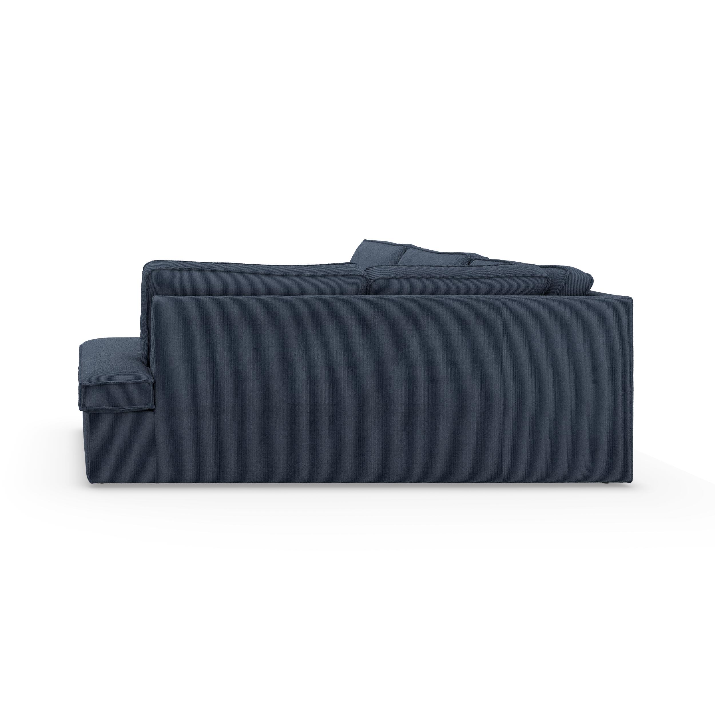 Högervänd hörnsoffa med puffavslutning, mörkblå klädsel i ett sofistikerat sammetstyg som heter Wave. Ben i svart plast, sitsar med kallskum och ryggkuddar fyllda med granulat och fiberfyllning. Soffans ram är tillverkad av FSC-certifierat och kontrollerat trä.