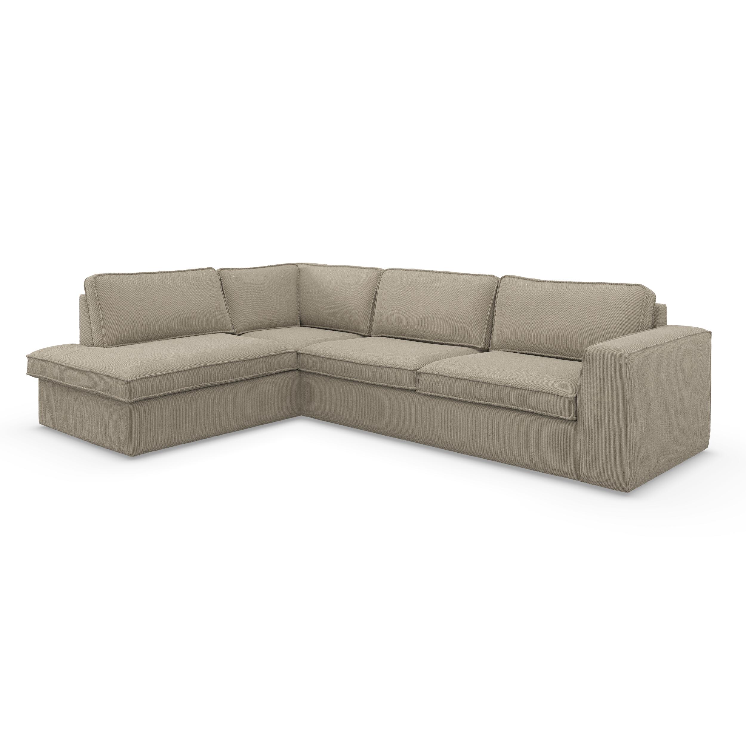 Vänstervänd hörnsoffa med puffavslutning, gråbeige klädsel i ett sammetstyg som heter Wave. Fyllningen består av granulat och fiberfyllning i ryggen och av kallskum i sittdynorna. Benen är i svart plast. Soffans ram är tillverkad av FSC-certifierat och kontrollerat trä.