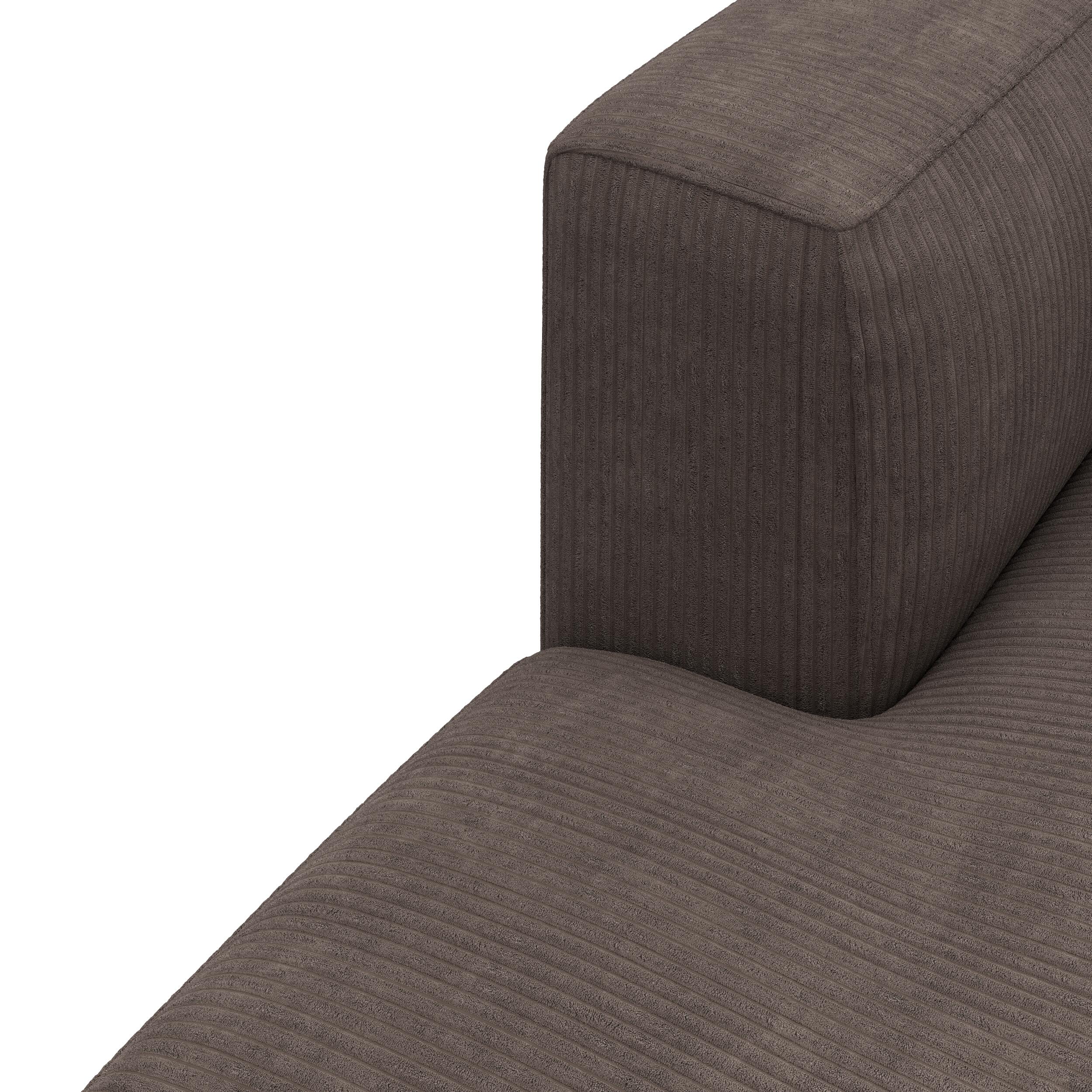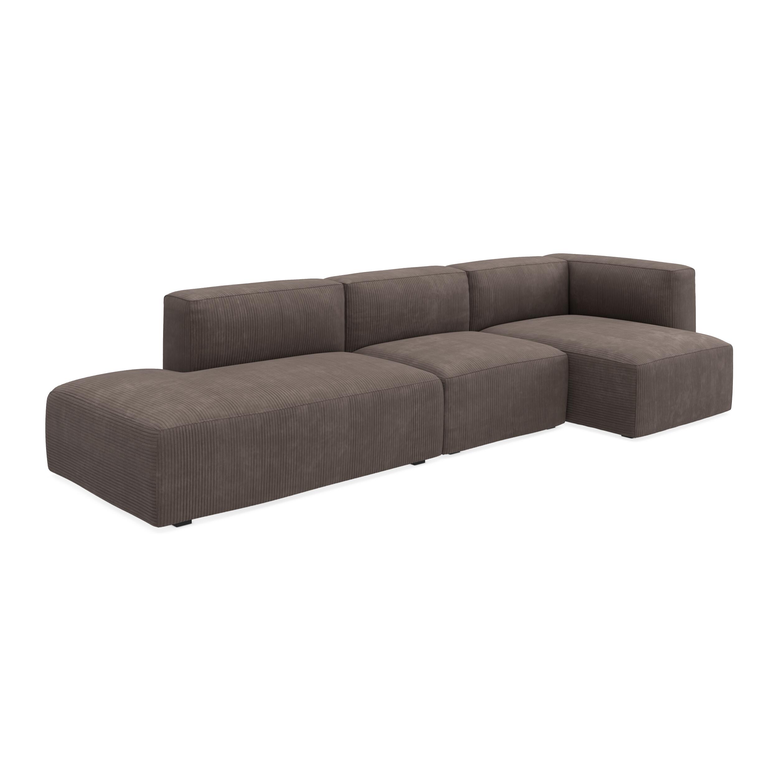 Modulsoffa med högervänd schäslong, bestående av tre moduler. Soffans låga, breda design och rundade former skapar ett modernt loungeutseende. Klädseln är i ett gråbeige tyg, kallat Poso, som ger soffan en taktil struktur, medan fyllningen av kallskum i säte och rygg säkerställer god komfort. Soffan står på diskreta, svartlackerade träben.